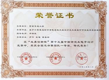經(jīng)過(guò)全國(guó)總決賽評(píng)比,西南交通大學(xué)信息科學(xué)與技術(shù)學(xué)院閆連山老師指導(dǎo)的參賽團(tuán)隊(duì)(余驍、王震、馮家城3位同學(xué)組成)完成的作品《智能多態(tài)無(wú)感測(cè)溫系統(tǒng)》,榮獲全國(guó)一等獎(jiǎng)、抗擊疫情專項(xiàng)獎(jiǎng)。信息科學(xué)與技術(shù)學(xué)院鄭宗良老師指導(dǎo)參賽團(tuán)隊(duì)(尹平、吳旭、徐嘉彬3位同學(xué)組成)完成的作品《基于口罩集成的可穿戴柔性天線設(shè)計(jì)及無(wú)線實(shí)時(shí)呼吸監(jiān)測(cè)系統(tǒng)實(shí)現(xiàn)》,榮獲全國(guó)一等獎(jiǎng),以及最佳技術(shù)論文獎(jiǎng)和華為嵌入式專項(xiàng)獎(jiǎng)。